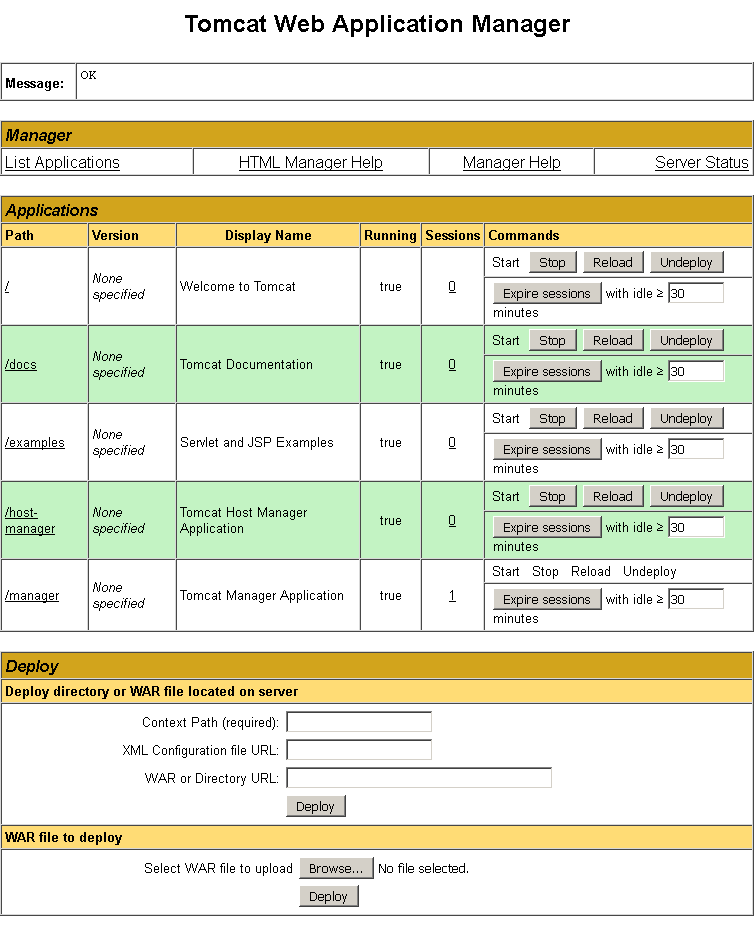 You should now be able to access the Apache Tomcat Web applications using the configured credentials. Here’s an example of the management Web application, which includes controls to deploy new WAR applications.